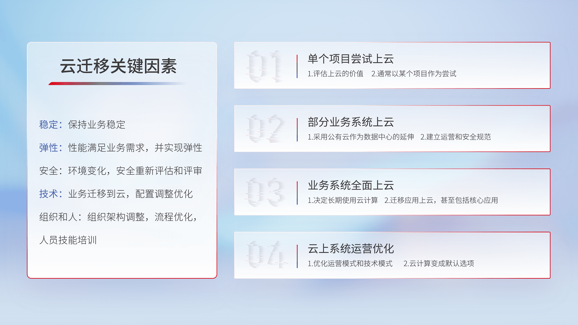 结合实际业务,,从规划设计、、云平台选型、、、、云原生改造、、数据迁移、、、集成交付,,,,迁移全过程为客户识别最佳上云路径,,,做好风险识别管理,,,,设计网络架构、、、身份权限、、、安全审计合规、、、、操作审计、、、日志审计、、监控告警策略、、多站点容灾设计等,,,,对云上基础设施进行整体规划,,,,提升IT治理水平,,以满足弹性、、、、高可用、、、、高性能的需求。。