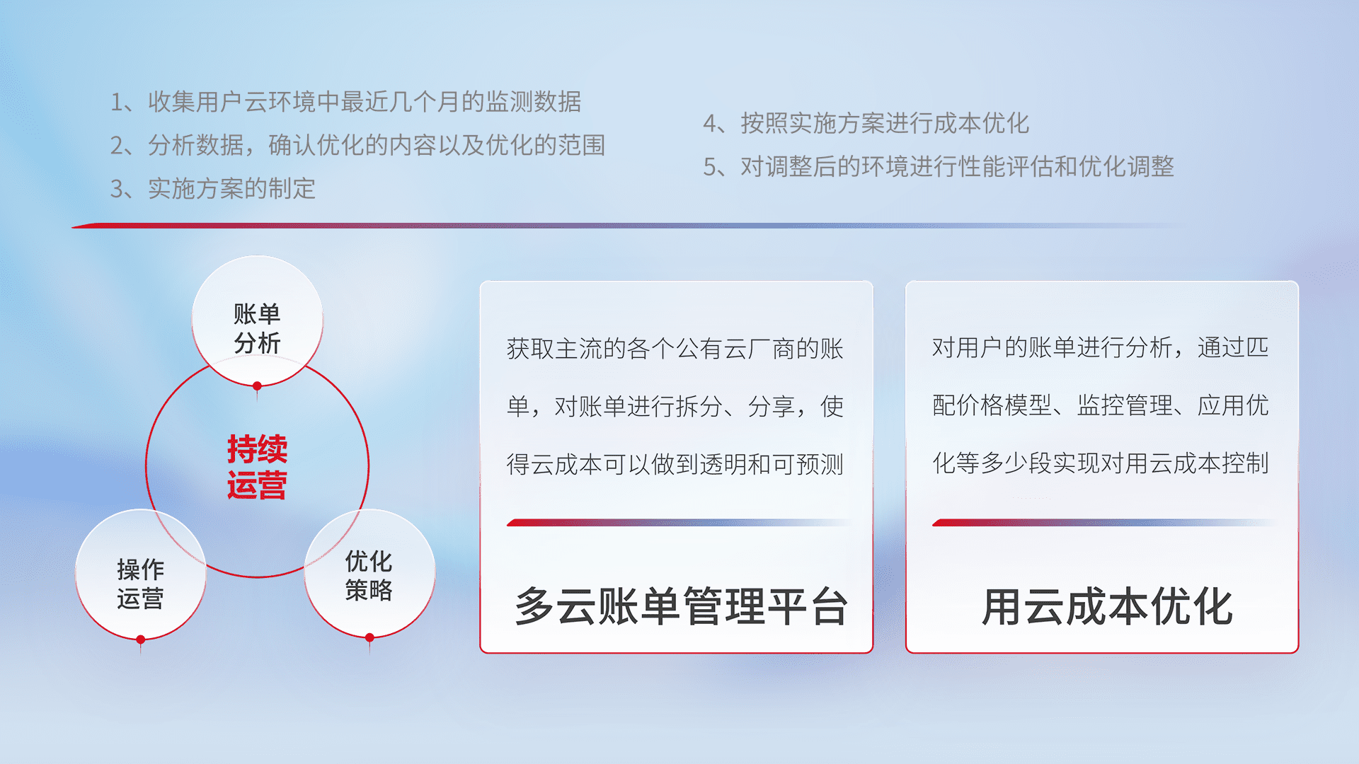 通过多云纳管,,,,以统一的资源数据模型把客户的云资源进行抽象和封装,,,进而实现对多云资源的统一操作,,,,保障云资源管理的可靠性、、、、稳定性与可用性。。。量身定制化运维内容,,配置、、、开发运维、、、、补丁管理、、备份、、监控、、、认证和访问管理、、、、审计和日常巡检等,,保障在用云过程中的可靠度,,,,稳定度以及高可用率。。