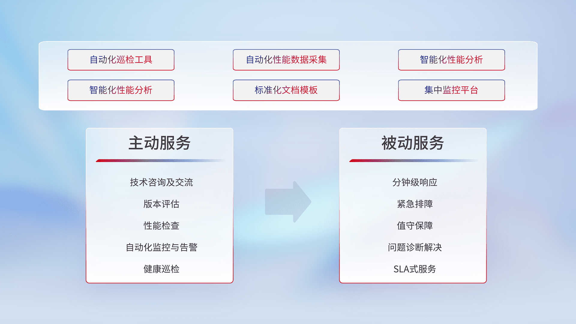 智能化工具和标准化文档,,保障服务质量,,提供主动服务(包含技术咨询、、、版本评估、、、、性能检查、、自动化监控与告警、、、、健康巡检)和被动服务包含(分钟级响应、、、紧急排障、、、、值守保障、、问题诊断解决、、SLA服务)。。。。